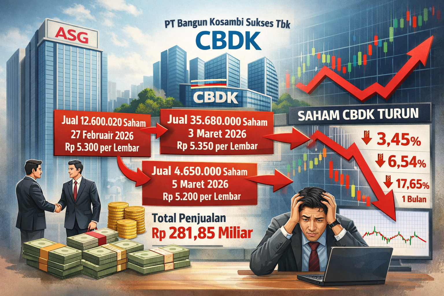 Manajemen PT Bangun Kosambi Sukses Tbk (CBDK) dalam keterangan tertulisnya pada Jumat (6/3) mengungkapkan bahwa ASG telah menjual saham dalam tiga transaksi. Transaksi pertama terjadi pada 27 Februari 2026, saat ASG menjual 12.600.020 lembar saham dengan harga Rp5.300 per lembar. Dari transaksi ini, ASG memperoleh sekitar Rp66,78 miliar.